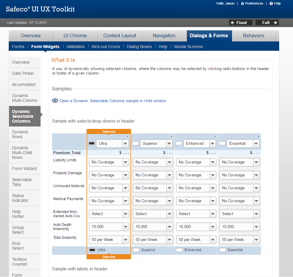 The UIUX Toolkit functions as a pattern library, style-guide, and code sample repository for all Agent and Employee facing servicing tools and portals at Safeco and Liberty Mutual. I designed, built, and maintained the site as well as the components/patterns it contains. This site is used by the UX design team as a reference for Safeco's standard patterns and styles. It is used by IT development teams as a guide and code resource for building components and tools.