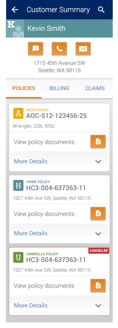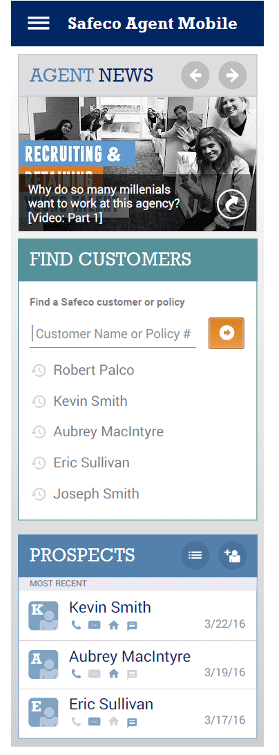 As a result of user research for the Safeco/Liberty Mutual B2B redesign, it was determined that our users wanted a mobile solution for the sales and servicing portal. My team was charged with the product and UX/UI design for this project.
