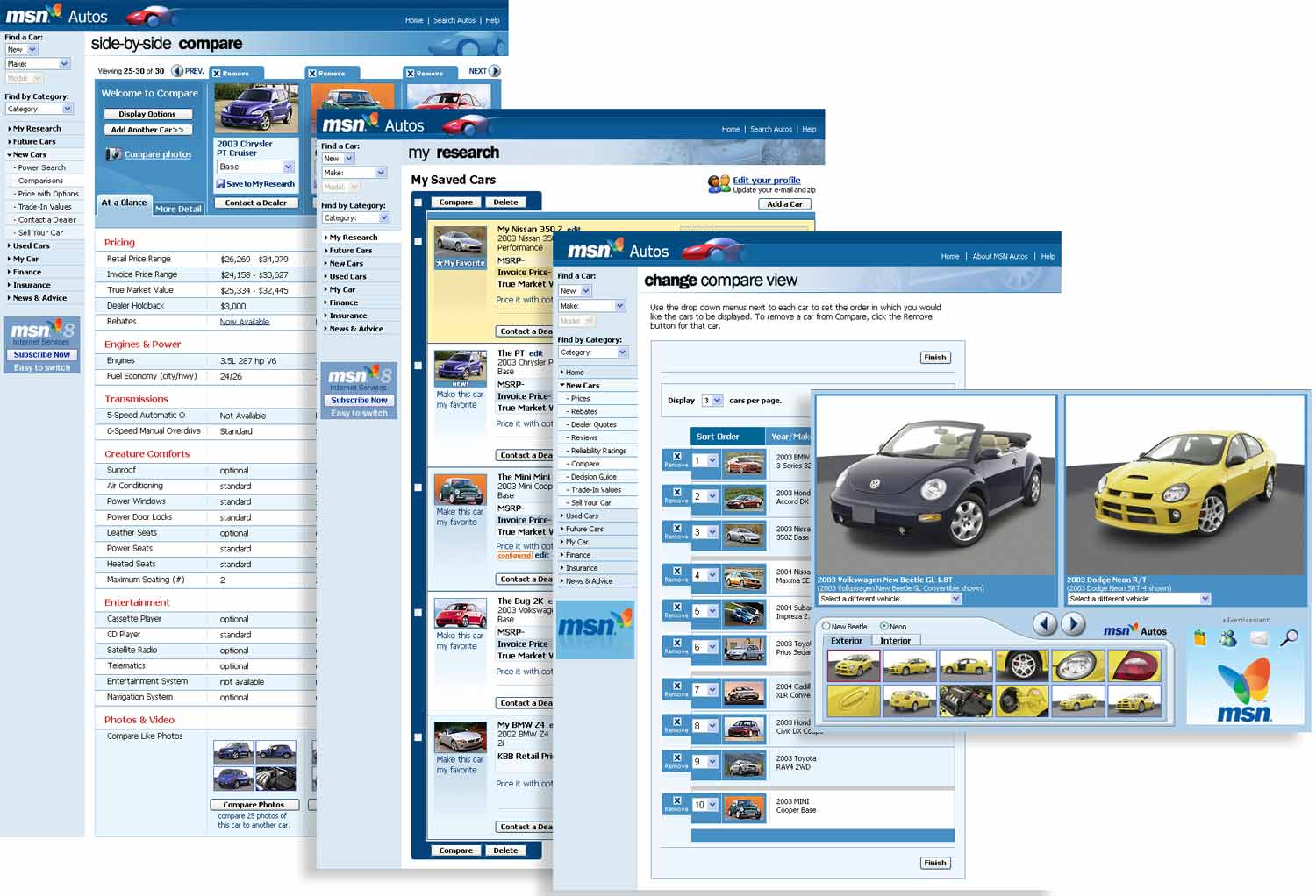 I was brought into Microsoft MSN to design tools for the Automotive Channel. I designed a series of four online tools consumers could use to research vehicles. My designs were tested in the Microsoft usability labs. These tools stayed live for seven years following my rolling off the project, virtually unchanged.