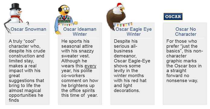 The policy servicing tools for Safeco Employees featured a cross-selling platform that would encourage and reward employees for up selling customers into other products and services. This system named OSCAR (Opportunities for Sales, Commissions And Rewards) used a help character in its presentation. Help characters were a good fit for this tool. The users worked in a competitive and gamification environment where they often used toys and chachkies to keep track of performance etc. We also found in our user research that many user were very fond on the existing character. One woman referred to him as her "little friend".
