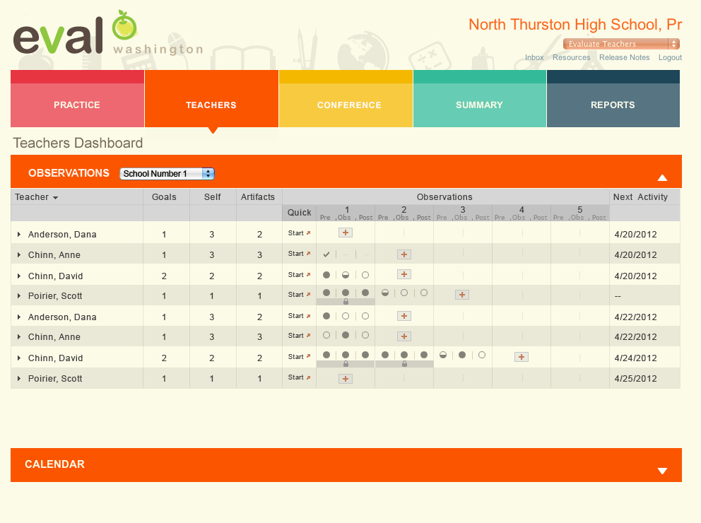 This web application was created to facilitate evaluations and tracking of teacher and principal performance for Washington State's public school system. From this UI, principals and administrators can schedule evaluations, rank performance, and record observations for all teachers and principals they are responsible for.