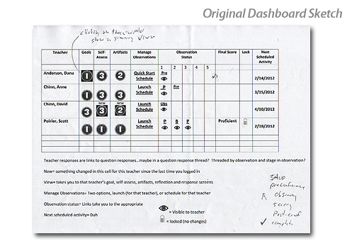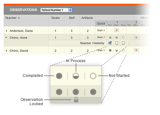 Principals and administrators have many direct reports to manage and keep track of. To make retrieval of the status of all of these reports easier and quicker, I developed some intuitive visuals to aid in comprehension. Each observation session consist of three parts (Pre-observation, Observation, and Post-observation). For each of those states their are three progress states (Not started, In process, and Completed). By using a circle with three levels of fullness, the user can easily scan large numbers of reports and extract the status they are looking for. The level of contrast between the states, in shape and tone, is a perfect aid for scanning.