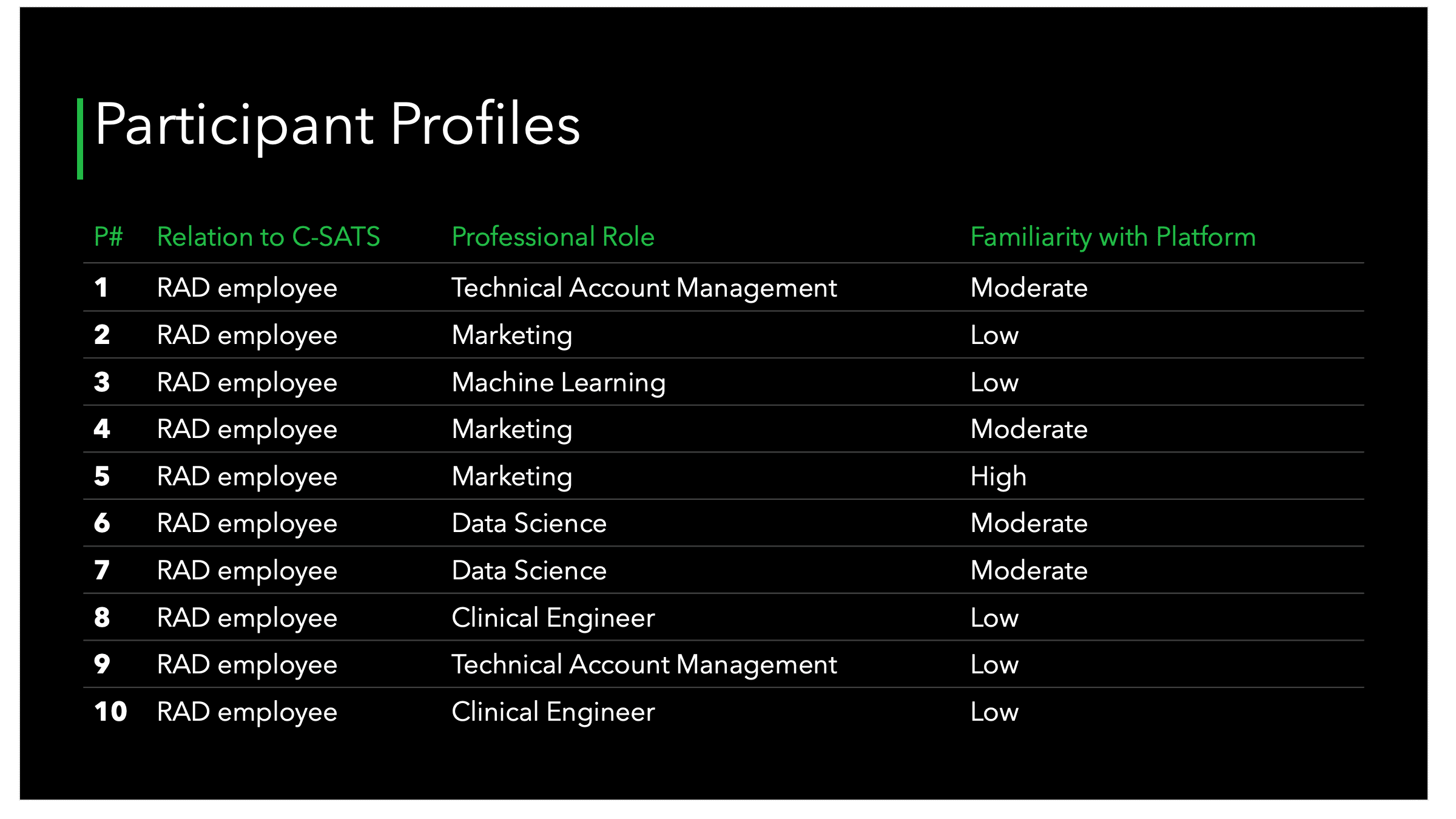 This feature was developed during the COVID-19 pandemic, and so access to our user base was still limited. I determined that internal employees, including our clinical teams, would be appropriate proxies for our users, because this particular feature does not require experience or knowledge specific to our surgeon users. It was more universal.